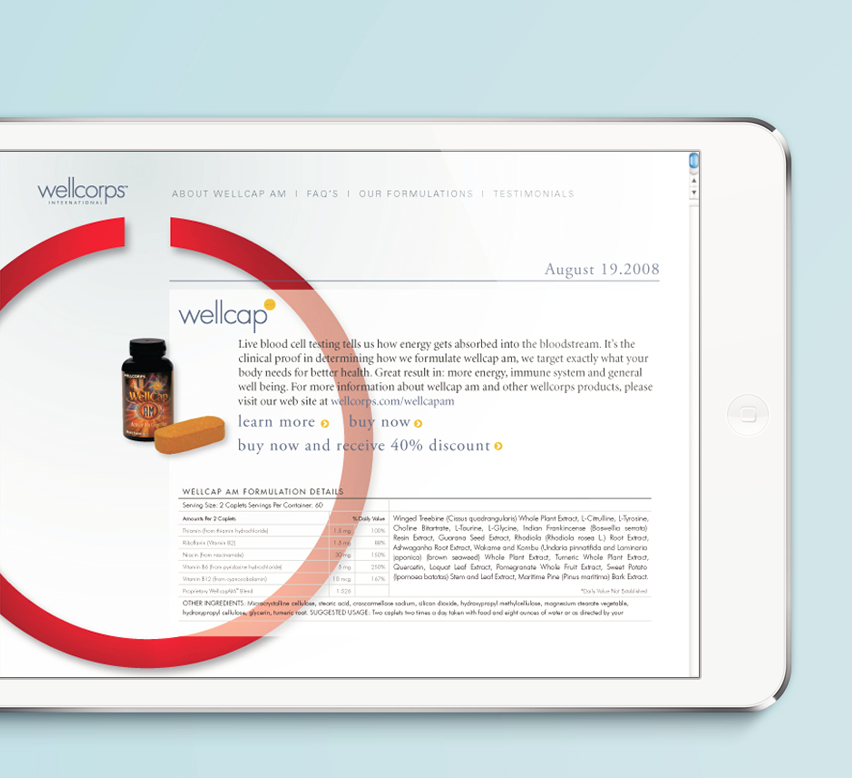 WellCorps International, founded in the mid 1990s, was a direct-sales company specializing in wellness and nutritional supplements. The company's philosophy was the belief that supplements should serve as a temporary boost or add-on when diet falls short due to modern lifestyle demands, rather than a daily replacement for a balanced, whole-foods-based everyday diet. This approach aimed to empower individuals to stay "on top and ahead" in fast-paced lives without substituting proper nutrition.